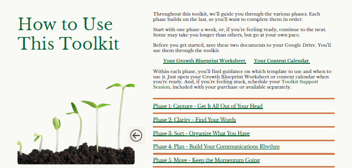 Most service-based entrepreneurs already have a sense of some of these pieces. They've thought about their audience and they have ideas about what they want to say. What's usually missing is a way to see everything together in one place so it actually becomes something you can work from.